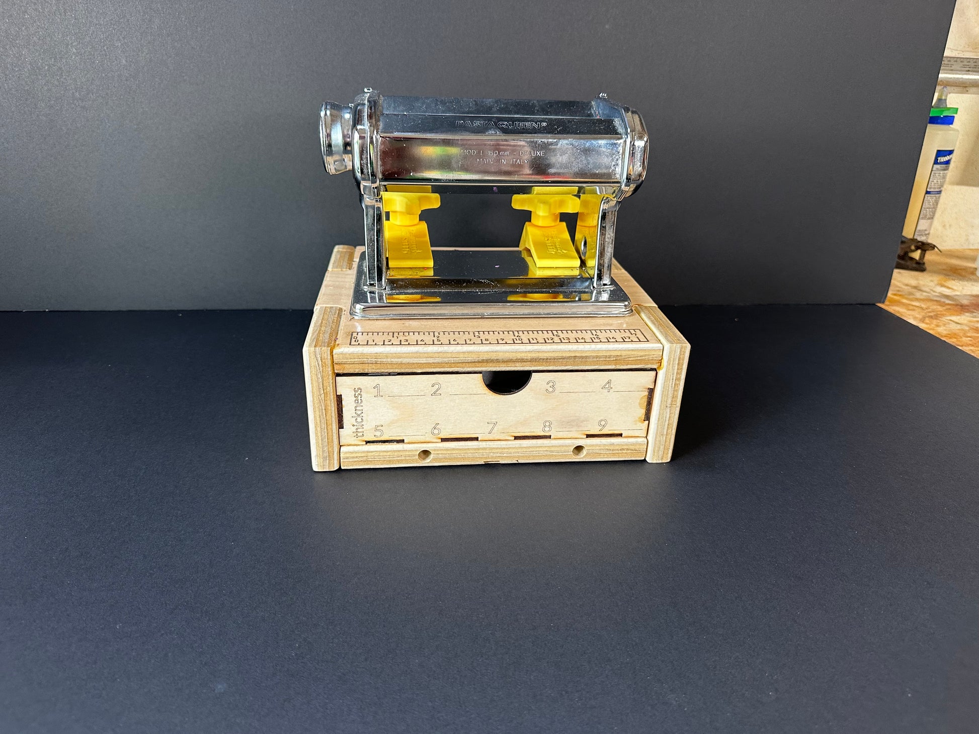 Exclusively designed by Heartwood and Steel, these handsome pasta machine stands feature a slotted groove for the included pair of clamps to hold your machine in place as well as another pair of clamps (fence clamps) to keep your entire work stand anchored to your table or counter top. The lower clamp attachment is designed to allow for continued access to the drawer, so you can keep tools or blades out of the way, but always close. The lower clamps can hold the machine from the front or either side to accommodate different work areas, including corners of tables or counter tops.